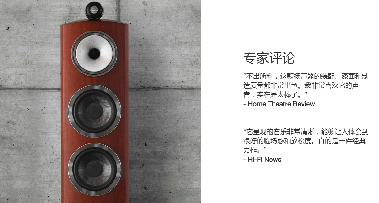 | 關(guān)鍵詞: | 804 D3 落地式揚聲器的細長(cháng)箱體中集成了 800 鉆石系列揚聲器的所有品質(zhì)和高級驅動(dòng)單元,可呈現出余音繞梁的細膩之音。 |